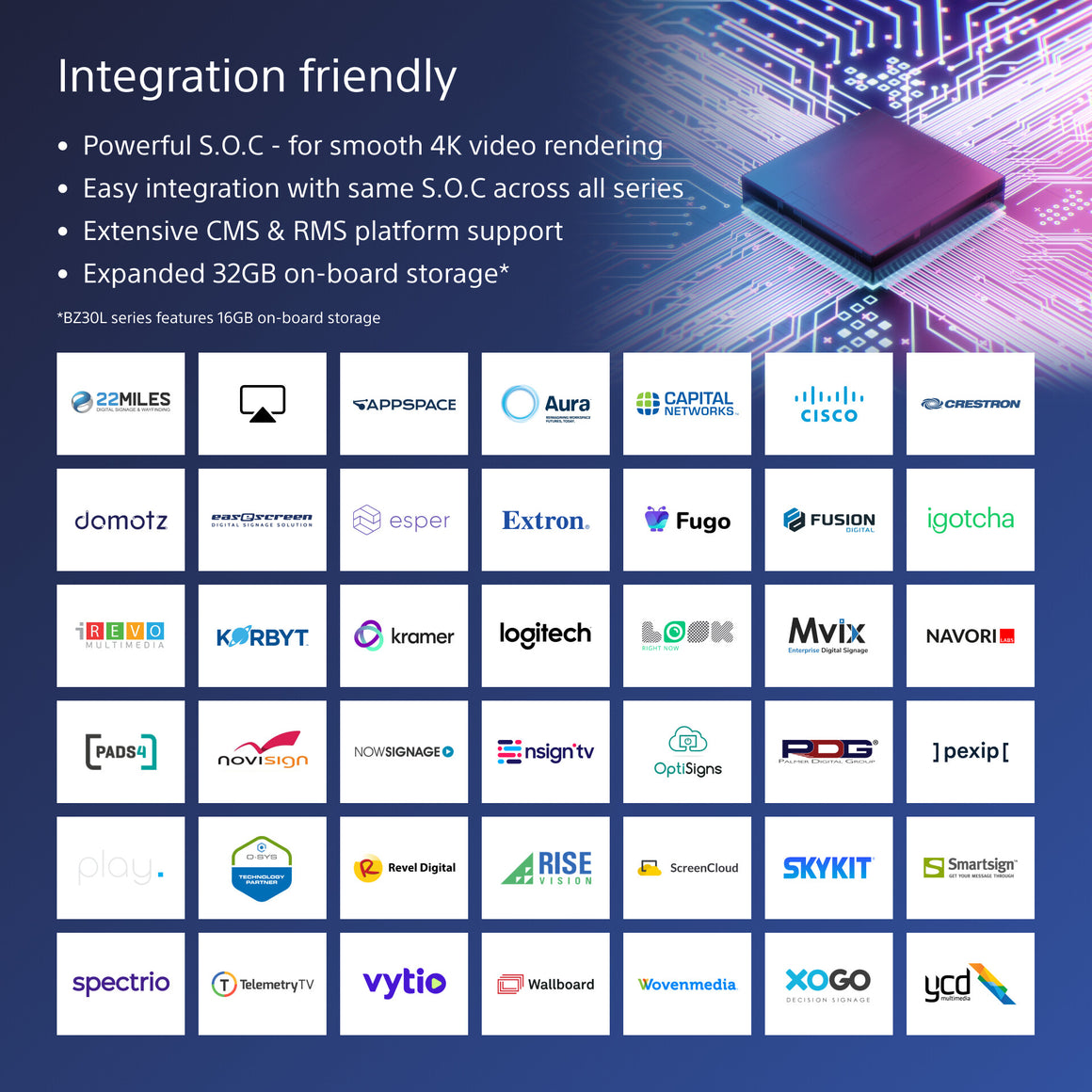 The internal memory on some other displays is eaten up by the operating system, leaving little space for your own apps and content. FW-65BZ40L doubles internal storage from 16GB to a generous 32GB – giving loads more room on board to hold apps, photos, videos and digital signage.