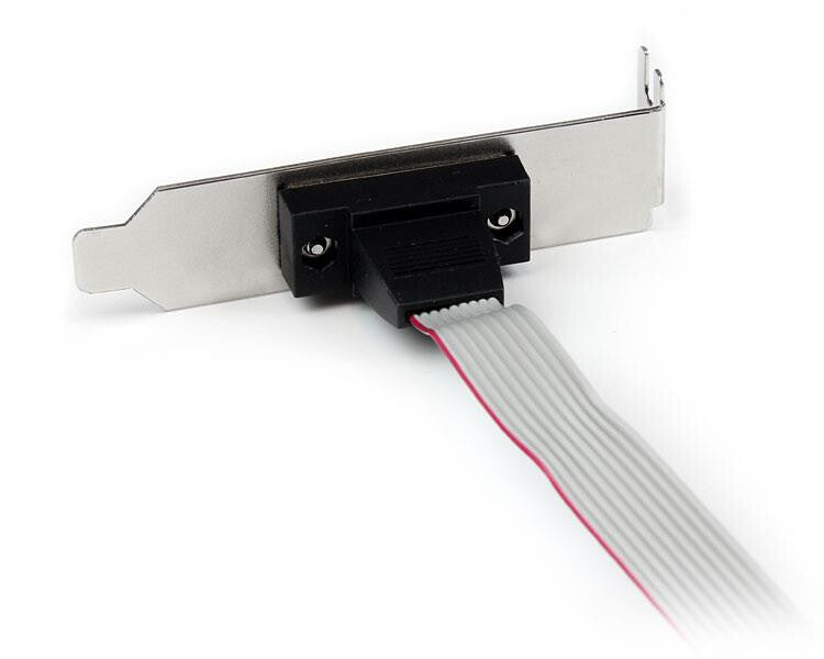 The PLATE9M16LP (16 inch/ 0.4 m) Low Profile Serial Plate adds a DB9 serial port to the rear panel of a small form factor/low profile computer, connecting to an IDC10 header connector on the motherboard.
