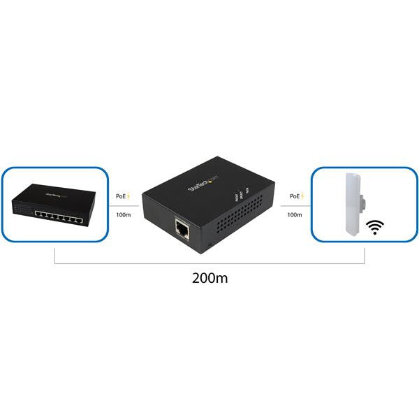 This Gigabit PoE+ extender spans your Power over Ethernet (PoE) device over longer distances, letting you double the 100m limitations of a traditional PoE infrastructure.