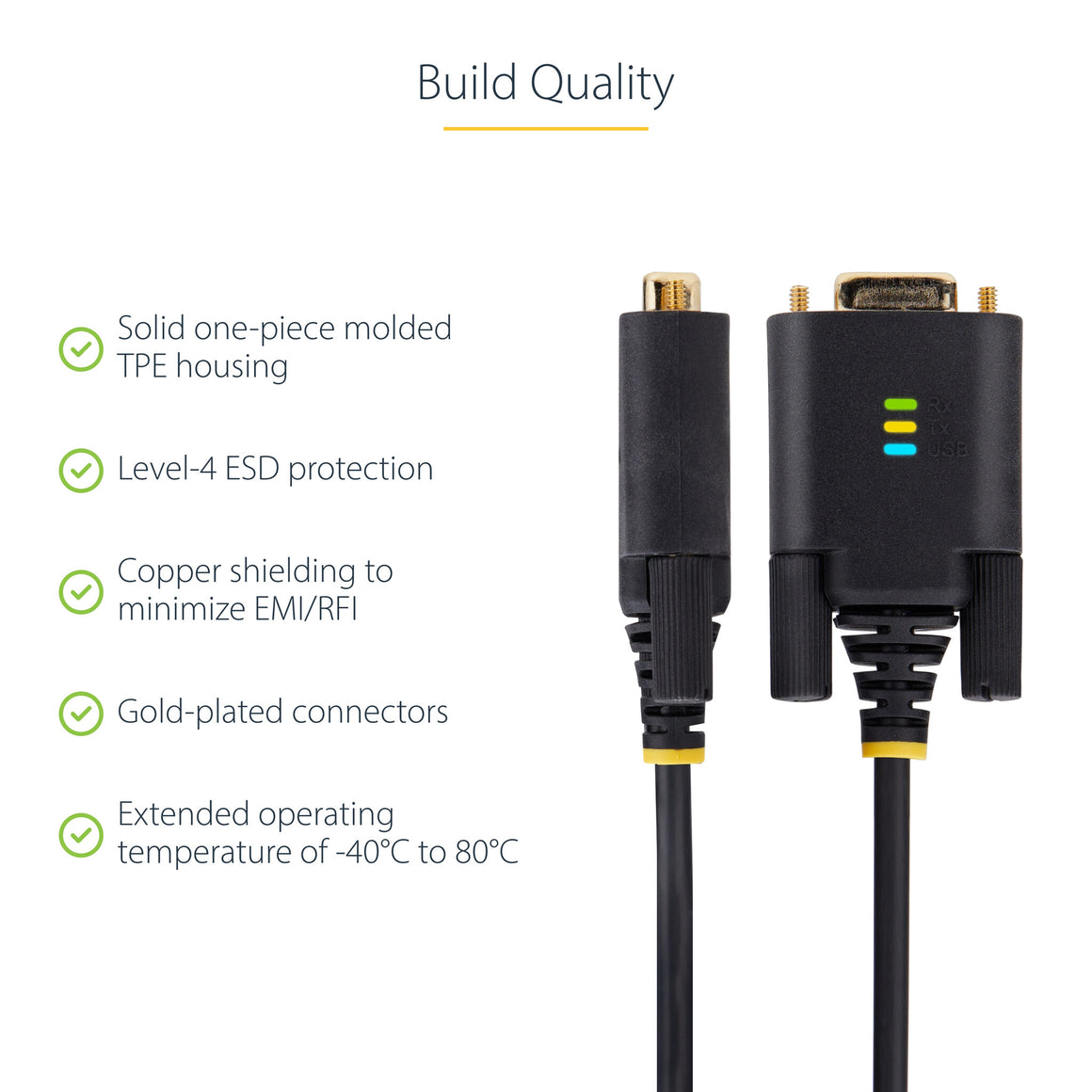 - BUILD QUALITY: Solid one-piece molded TPE housing and Level-4 ESD protection (15kV air/8kV contact) enhance the serial adapters reliability and longevity; Copper shielding minimizes EMI/RFI interference; Gold-plated connectors