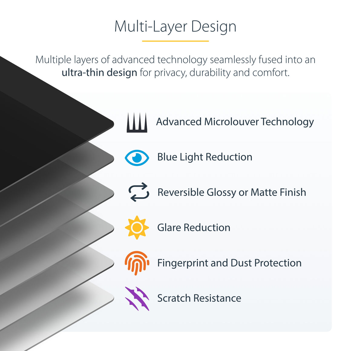 The privacy screen protector is reversible, with a matte anti-glare side for environments prone to glare and a high-gloss side that helps retain color vibrancy. The matte side provides additional screen protection with a fingerprint and scratch resistant coating. The privacy shield has a light transmittance of 60% providing optimal screen brightness and enhanced levels of privacy.
