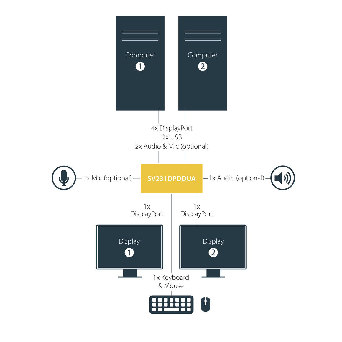 The SV231DPDDUA 2-Port USB Dual DisplayPort KVM Switch with Audio and USB 2.0 Hub combines next generation digital display standards with seamless KVM control, allowing you to switch between 2 dual head or twin DisplayPort systems. Also ideal for systems with a single DisplayPort output, and a second video source such as DVI or HDMI, using a low cost accessory adapter.
