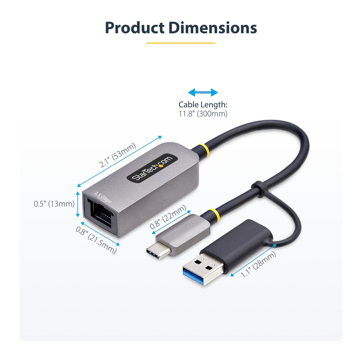 StarTech.com 2.5GbE USB-C to Ethernet Adapter with USB-A Converter, NBASE-T NIC, USB 3.0 Type-C 2.5/1G Multi Speed Network, Thunderbolt Compatible, Windows & Mac