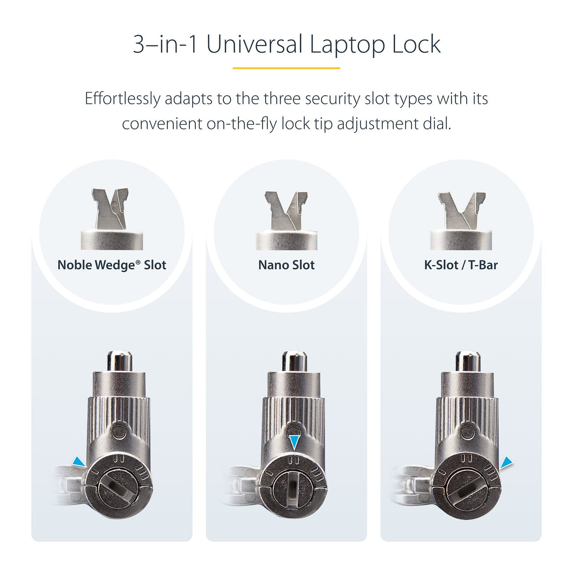 A unique on-the-fly lock tip mechanism enables quickly adapting the lock tip to fit different security slot types. Simply rotate the lock selection dial to change the shape of the lock tip to match the security slot, without requiring additional tools or carry separate lock tips. The cut-resistant steel security cable is 6.6ft (2m) long providing reach and durability.