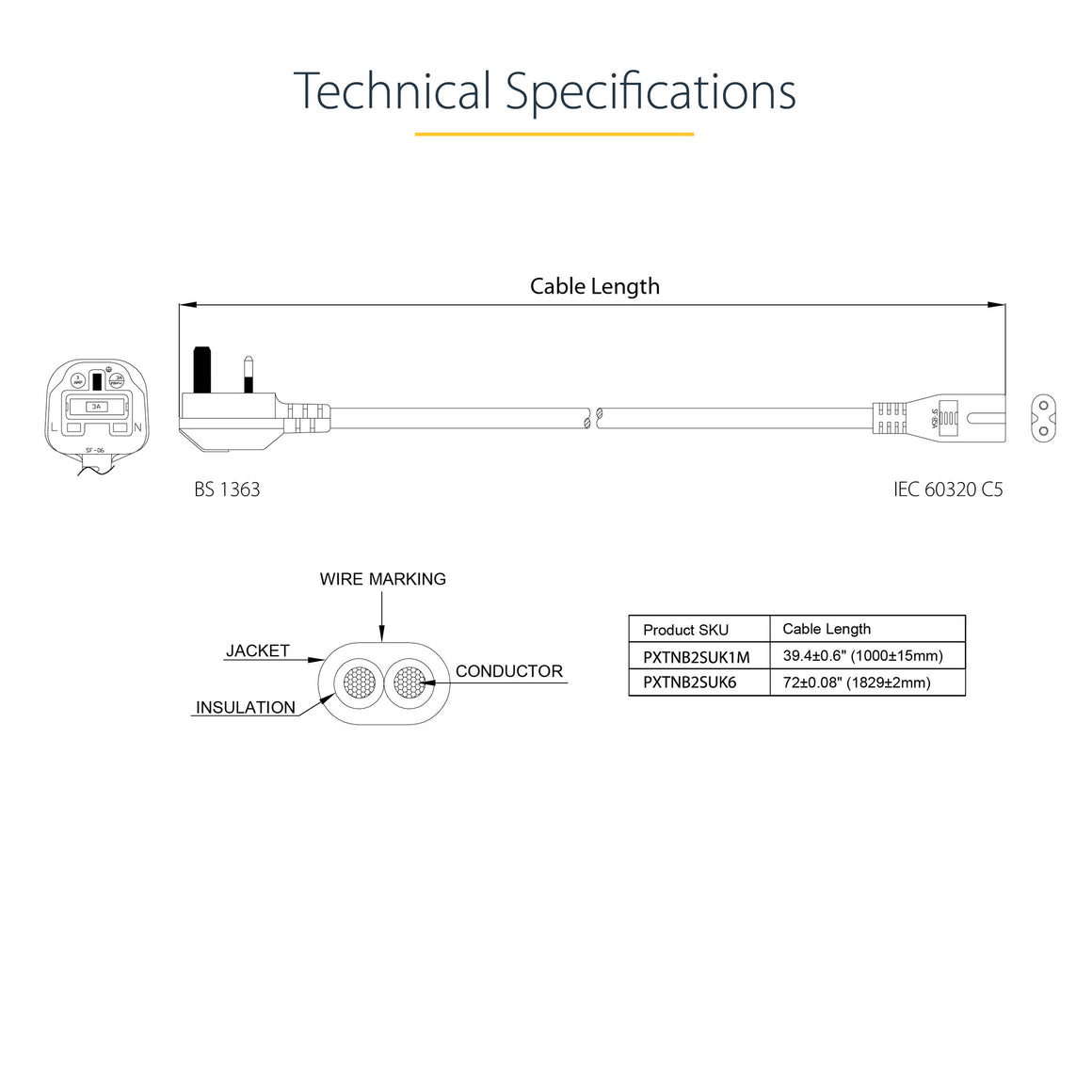 - SPECS: 3.3ft (1m) UK Computer Power Cable / BS 1363 to IEC 60320 C7 / 18AWG (0.75mm2) / 250V 2.5A (Max) / Jacket Rating: H03VVH2-F / Jacket Material: PVC / Color: Black / Temperature Range: 2℃ to 60℃ / Jacket Dimensions: 3.5x6.8 mm