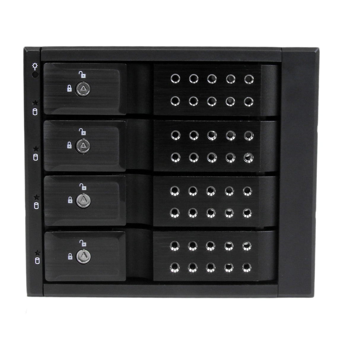 For a quick and secure method of installing and removing drives, the backplane features ejection levers and a key-lock design. To help prevent drive failure, the bay provides drive cooling with a built-in fan and excellent heat dissipation with a vented aluminum enclosure.