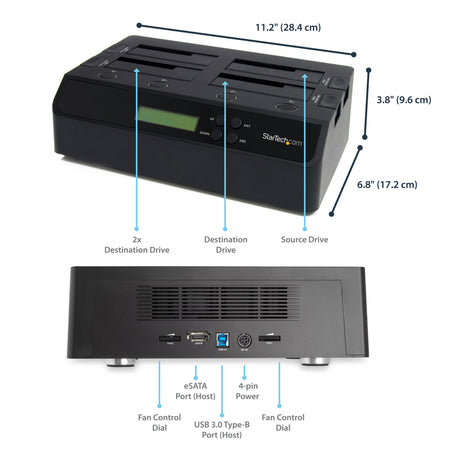 Able to perform 1:3 sector duplication, including HPA, from a single SATA drive onto three others simultaneously (at a rate of up to 72 MBps), the duplicator/docking station can save you time and effort. As an external HDD dock, it can be connected to your host computer through USB 3.0 or eSATA, providing data transfer speeds up to 5 Gbps or 3Gbps respectively, from the hard drives to your computer system.