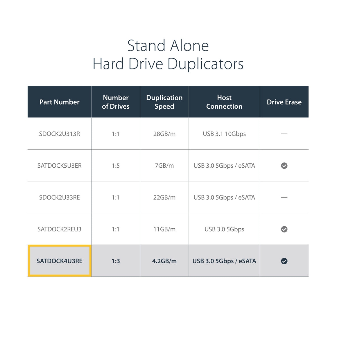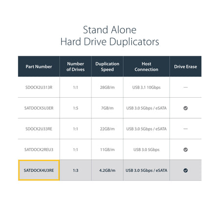 The SATDOCK4U3RE USB 3.0 and eSATA 1-to-3 Hard Drive Duplicator docking station enables you to duplicate/clone a single SATA hard drive to up to three other SATA drives simultaneously, as a standalone device. The duplicator can also function as a regular 4-bay hard drive docking station, by connecting to a host computer system. Large capacity drives (tested with up to 4TB 3.5" and 1TB 2.5" drives per bay) can be used to greatly enhance your computer's storage/backup capabilities.