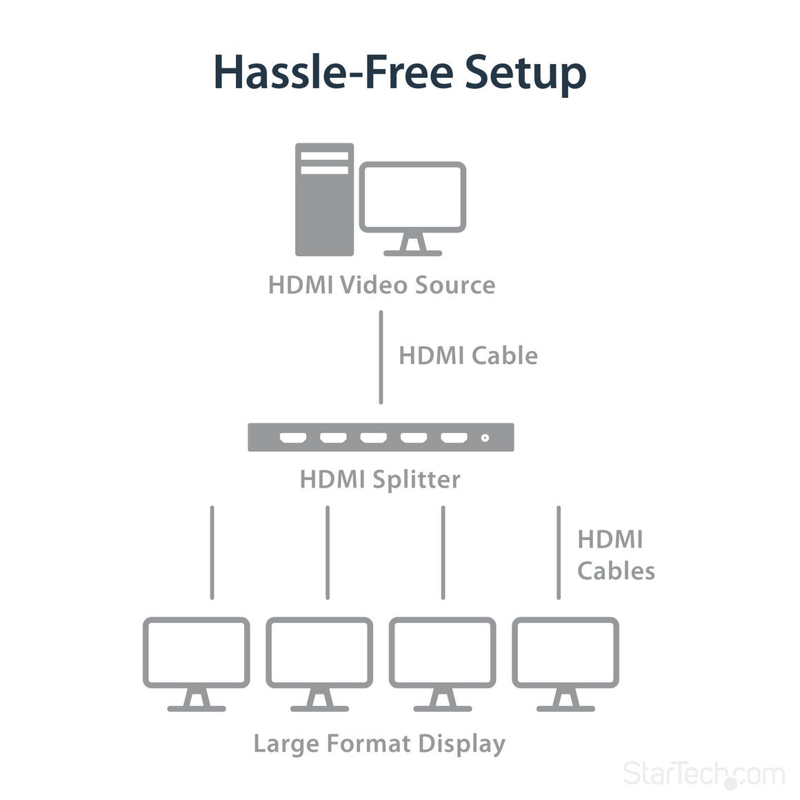 For hassle-free setup, the 1x4 HDMI splitter offers easy plug-and-play installation. The splitter also saves you setup time by automatically passing EDID between your video source and the display attached to port 1, ensuring settings like native resolution and refresh rate are configured properly.