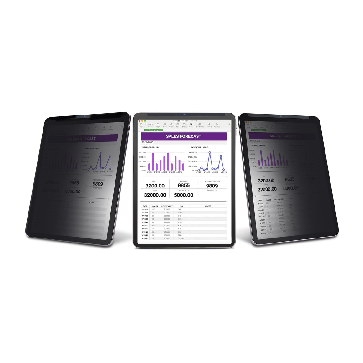 The security filter ensures optimal privacy in portrait or landscape orientations when viewed beyond 30° from the center, covering a total visible area of 60°. It supports touchscreen input and gestures, preserving the interactive experience of an iPad while maintaining the confidentiality of on-screen content.