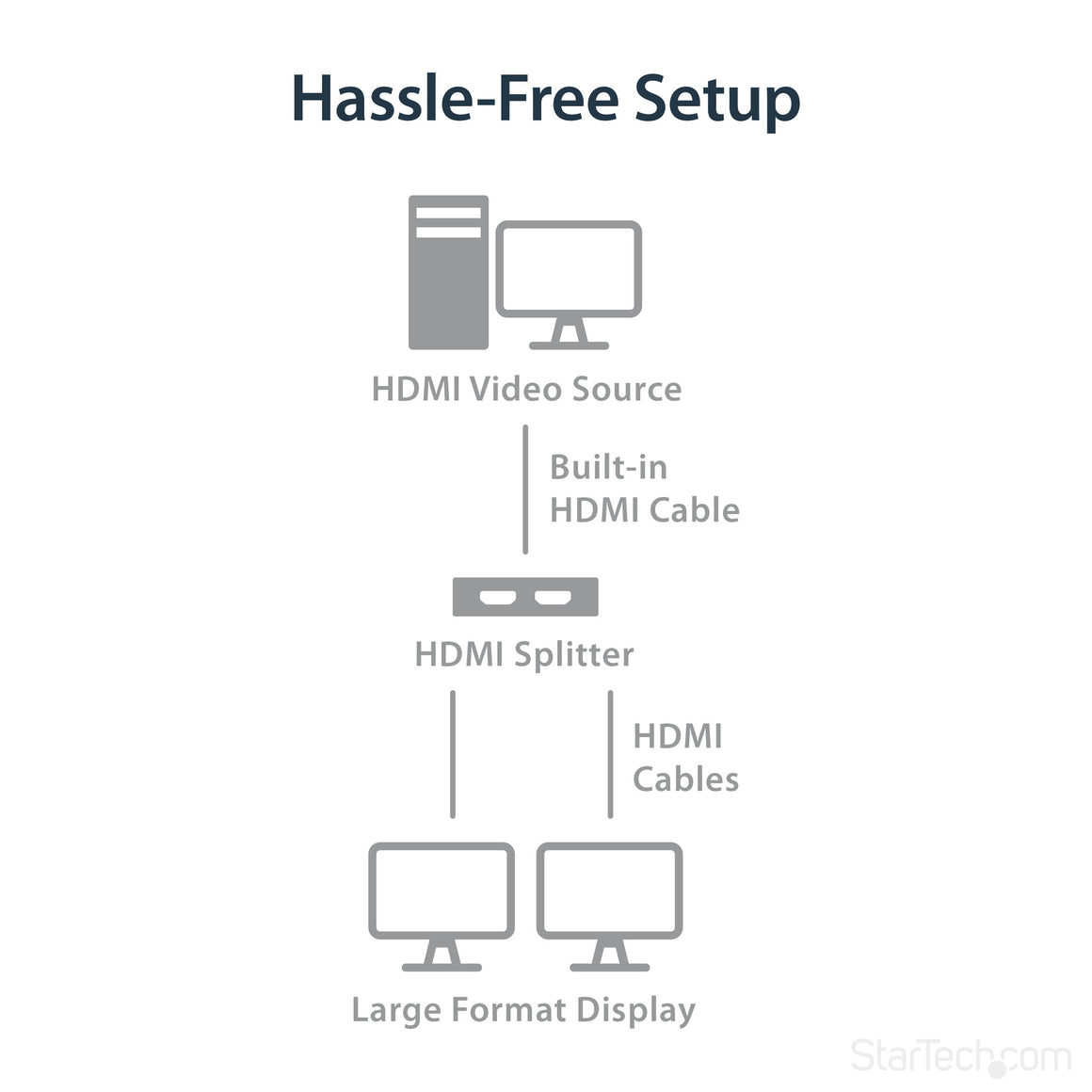 For a hassle-free setup you can power the HDMI splitter with the included USB cable, or power adapter depending on which is most convenient for you. Plus, the splitter features a built-in HDMI source cable, which lets you connect it directly to your HDMI source without the expense of additional cabling.