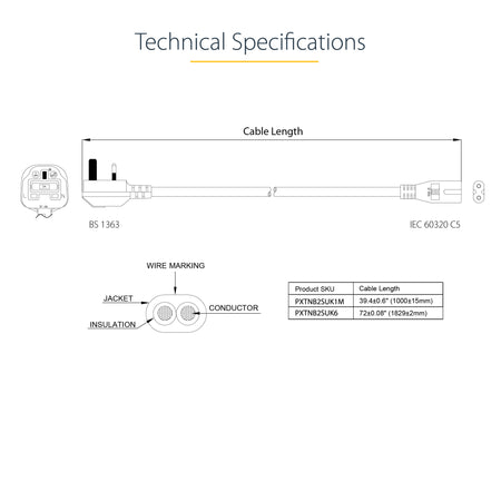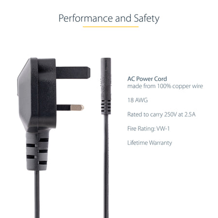 6ft (1.8m) UK Laptop Power Cord, BS 1363 to C7, 2.5A 250V, 18AWG