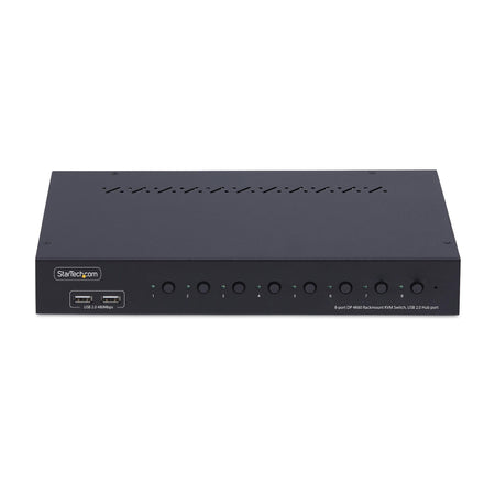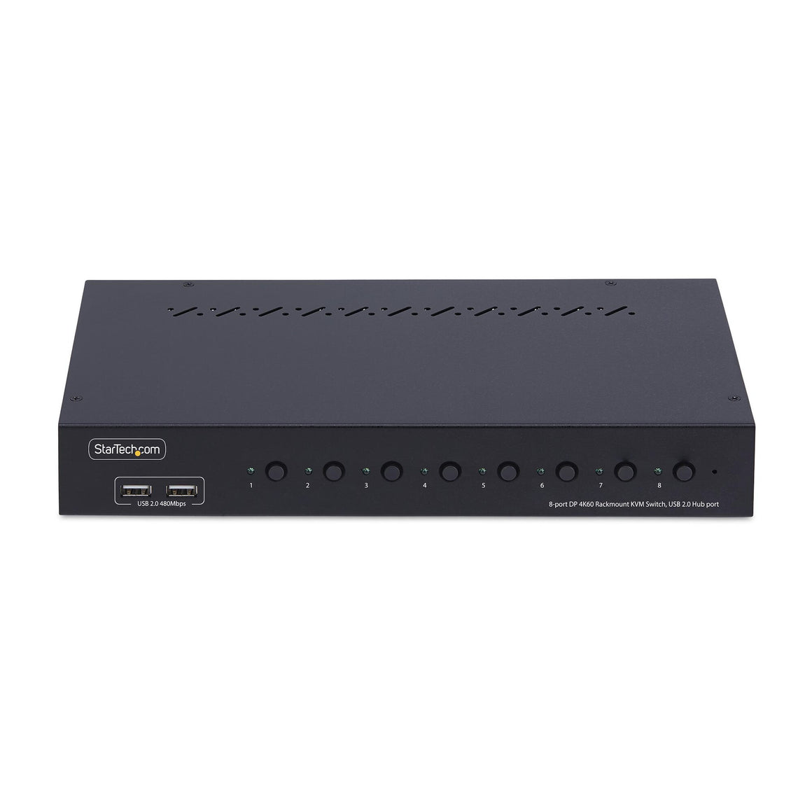The 4K 60Hz rackmount KVM switch allows switching between eight DisplayPort-enabled computers, sharing a keyboard, mouse, audio, 4-port USB 2.0 hub, and a 4K 60Hz DisplayPort 1.2 monitor. This enables effortless multi-system management, improved workspace efficiency, and enhanced productivity.