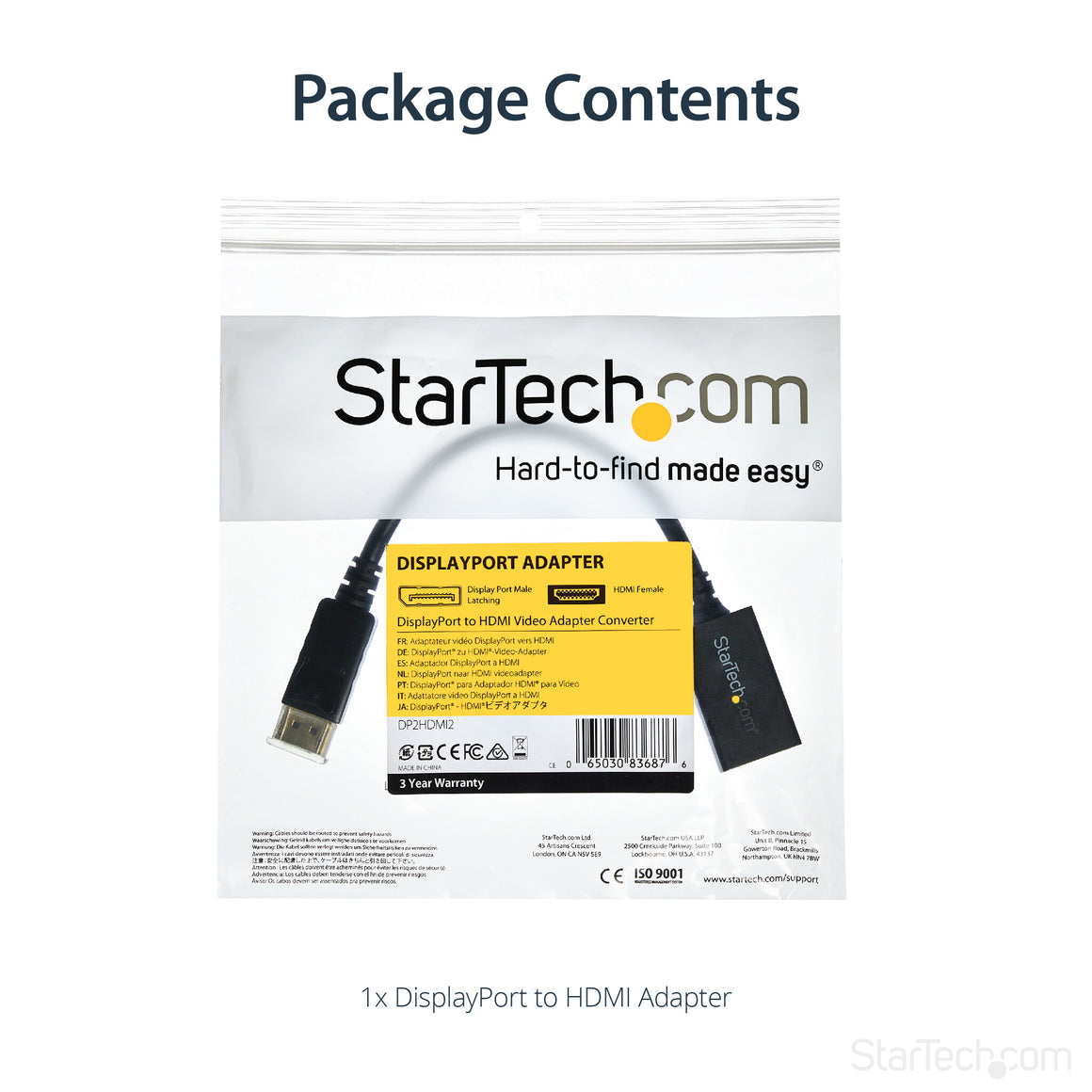 The StarTech.com DP2HDMI2 DisplayPort® to HDMI® Adapter lets you connect an HDMI-enabled display or projector to a DisplayPort out port from a computer (desktop or laptop), eliminating the expense of having to upgrade your display for DisplayPort compatibility.