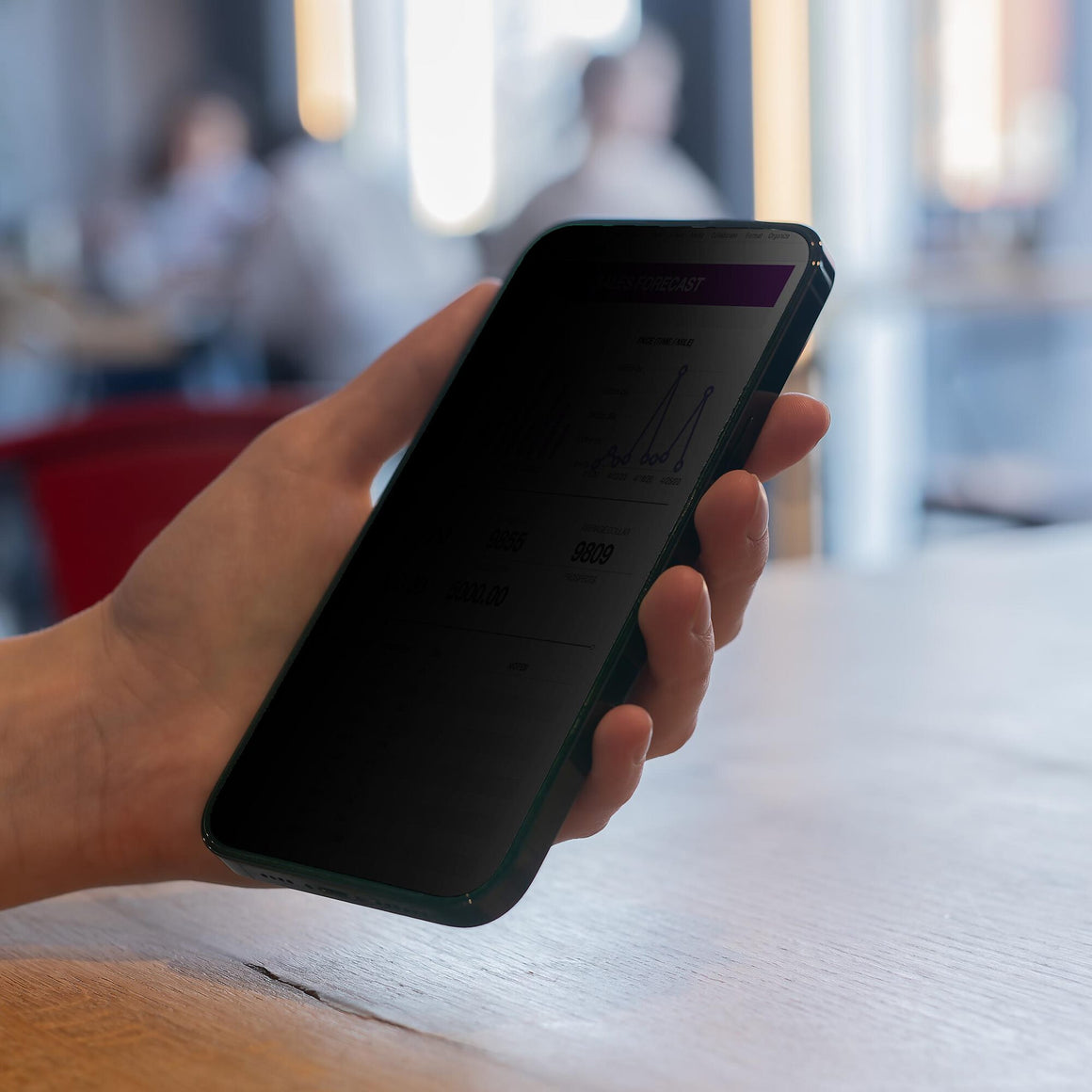 This Privacy Screen for the iPhone 15 smoothly transitions from a clear view to an obscured screen beyond the intended viewing angle, significantly enhancing visual privacy in office or public environments.