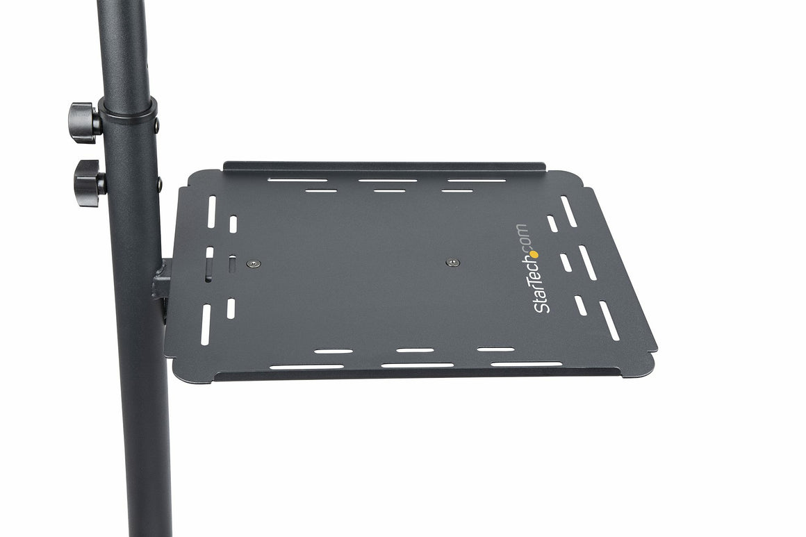 The upper tray has surface area of 13.8"x11.8" and lets you setup a laptop or projector depending on your needs. You can adjust its height (37.4" to 57" from the floor) and tilting angle (+/-12°) to provide a better viewing experience that will adjust to your presentation needs. Adjustments can be made by hand via the rotary knob locks.