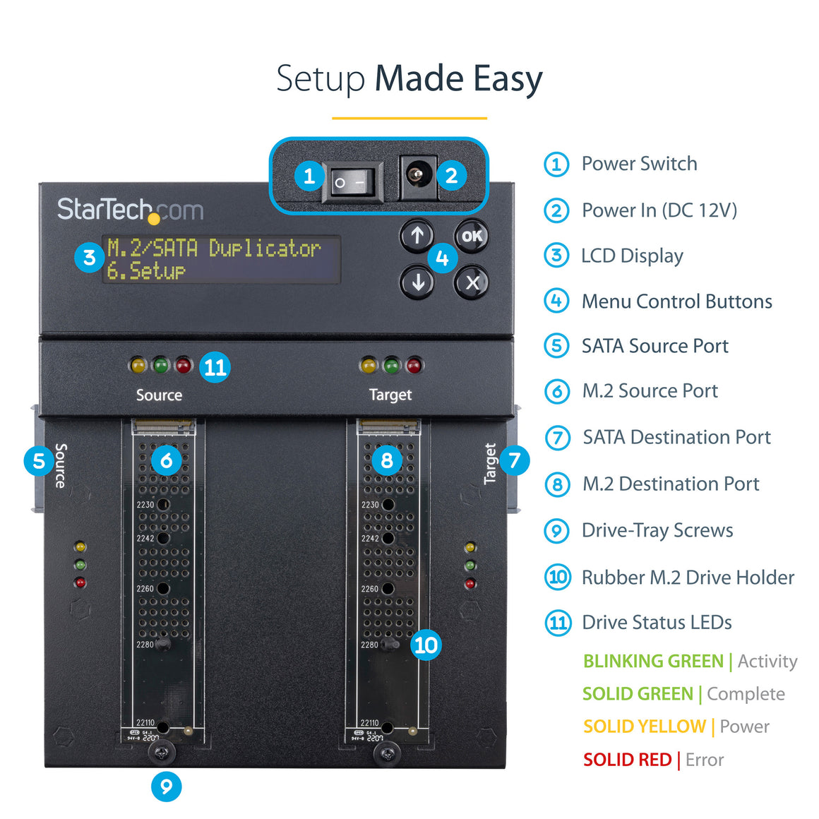 Supporting different types of drives including M.2 PCIe (M-Key), M.2 SATA (B+M-Key), and SATA 2.5/3.5 in. drives, this HDD/SSD cloner and wiper provides a versatile solution for drive cloning and deleting applications. The drive cloner enables duplication with any combination of drives, supporting duplication between M.2 (NVMe/AHCI), M.2 SATA, and 2.5/3.5" SATA drive interfaces. You can also expand the capabilities of the device to supporting IDE and mSATA drives using StarTech.com drive adapters: SATA to IDE Adapter (SAT2IDEADP) / SATA to mSATA Adapter (SAT32MSAT257) (each sold separately).