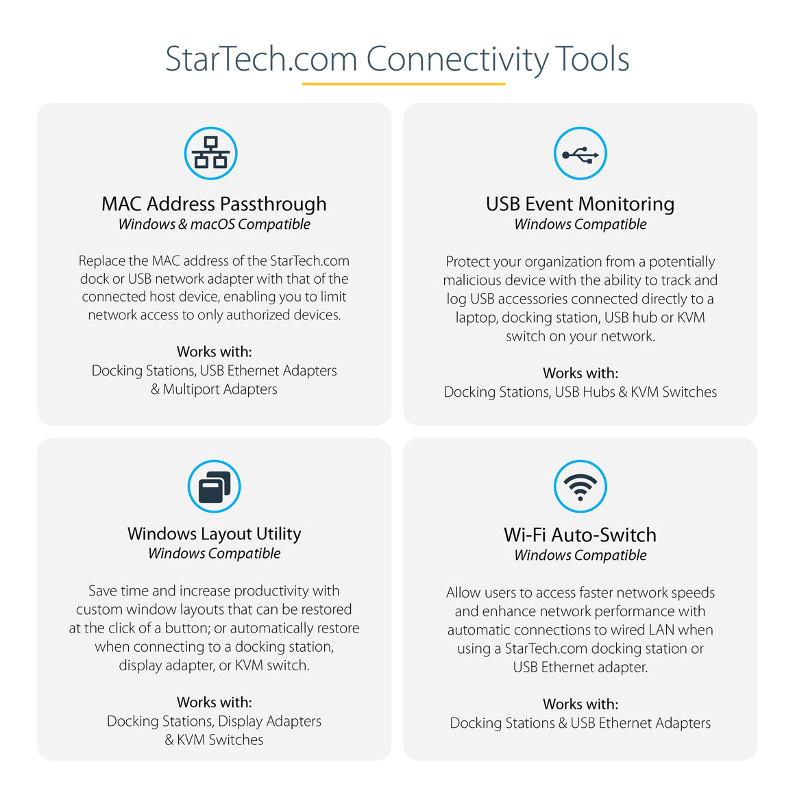 Developed to improve performance and security, StarTech.com Connectivity Tools is the only software suite on the market that works with a wide range of IT connectivity accessories. The software suite includes: