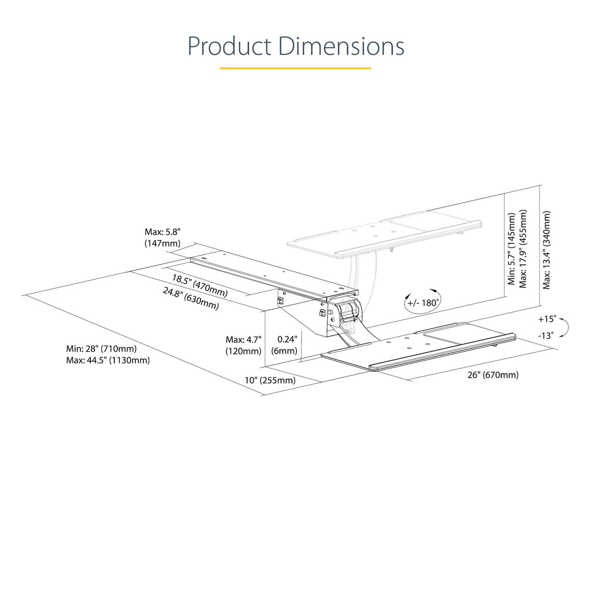 Easily adjust your spring-assisted keyboard tray down or up with the height adjustment paddle, with a total range of up to 13.4" (340 mm) that can be locked in at any position. You can slide the keyboard tray in or out from your desk to find your ideal position. Conveniently adjust the lever at the side to tilt the keyboard tray +15° / -13° for added comfort. You can even adjust your keyboard tray to the left or right, with +180° / -180° swivel.