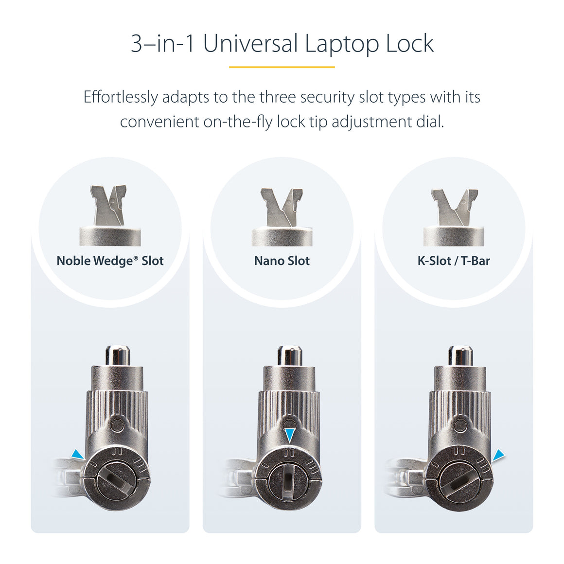The Universal Laptop Lock is a versatile solution compatible with Noble Wedge®; K-Slot (T-Bar), or Nano, providing flexibility and convenience. Its on-the-fly lock tip adjustment feature enables effortless compatibility with the different security slot types. The cut-resistant steel security cable measures 6.5 ft (2 m) in length and 0.17 in (4.4 mm) thick, providing reach and durability. With the 3-in-1 Laptop Lock, protect your valuable devices wherever you go.