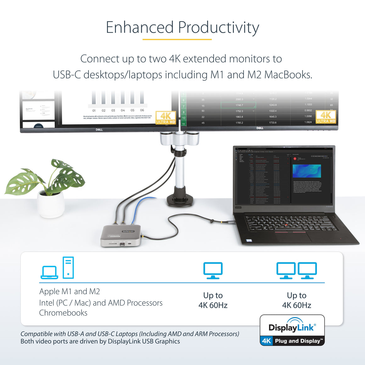- WORKS WITH ANY LAPTOP: Simplify your deployment with a USB-IF and VESA-compliant, DisplayLink-certified docking station that delivers optimal performance and universal compatibility with any laptop (Windows, macOS, and Ubuntu) or Chromebook (ChromeOS)