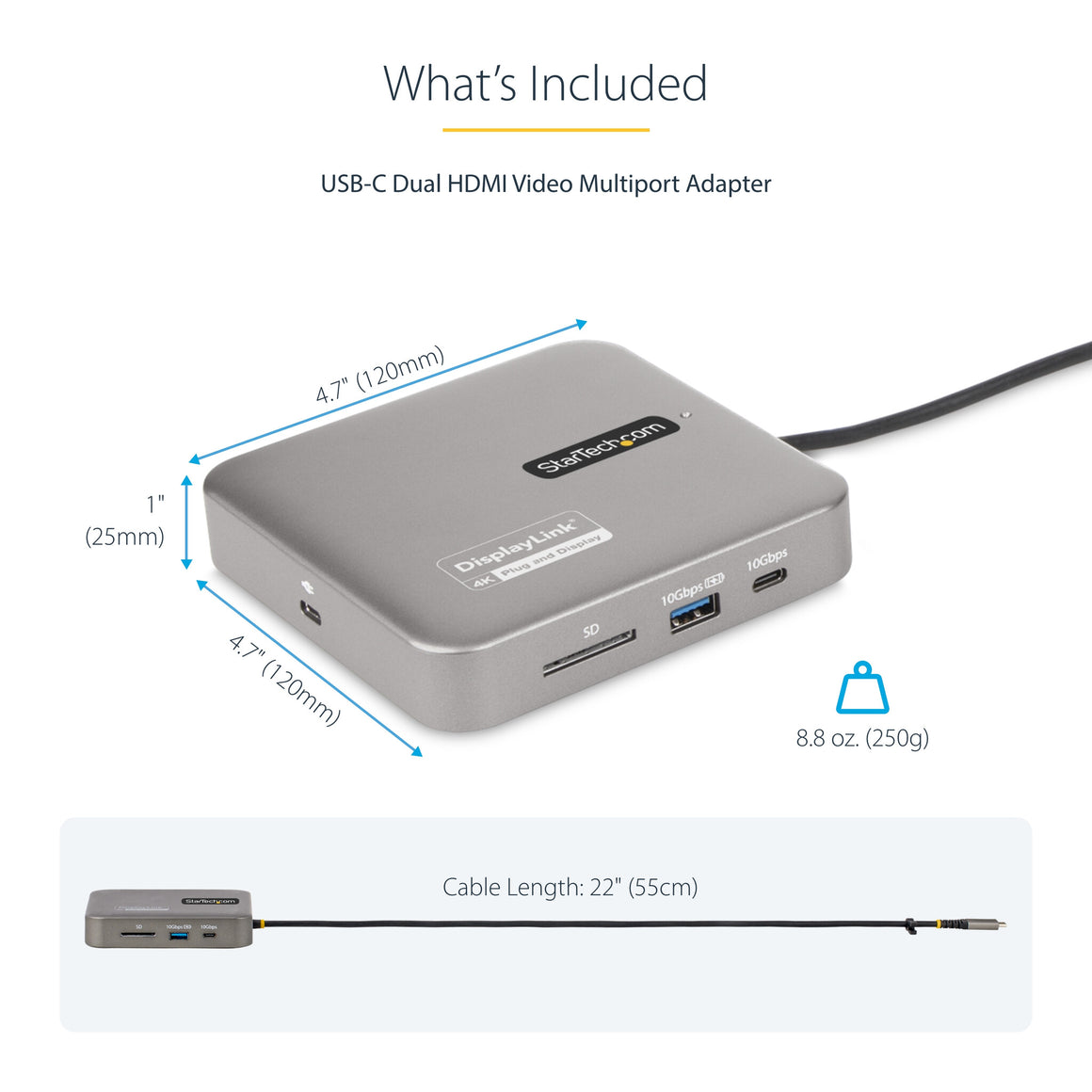 This USB-C Mini Dock / Multiport Adapter supports up to dual 4K 60Hz HDMI 2.0 converting your Dell XPS, MacBook or other USB-C laptop or tablet into a workstation, anywhere you go. The USB Type-C™ Multiport Adapter features 2x HDMI video outputs, a 2-Port USB 3.2 Gen 2 (10 Gbps) Hub (1x USB-A with B.C 1.2 charging, and 1x USB-C), an SD card reader, and Gigabit Ethernet. The adapter connects to your host computer's USB-C, USB4, or Thunderbolt 3/4™ port. Charge your host laptop and any attached USB peripherals by connecting the host laptop's power supply to the dedicated USB Power Delivery (PD) 3.0 port. The Multiport Adapter features an extra-long attached 22-inch (55 cm) host cable - for an extended reach, to offer more set up flexibility.