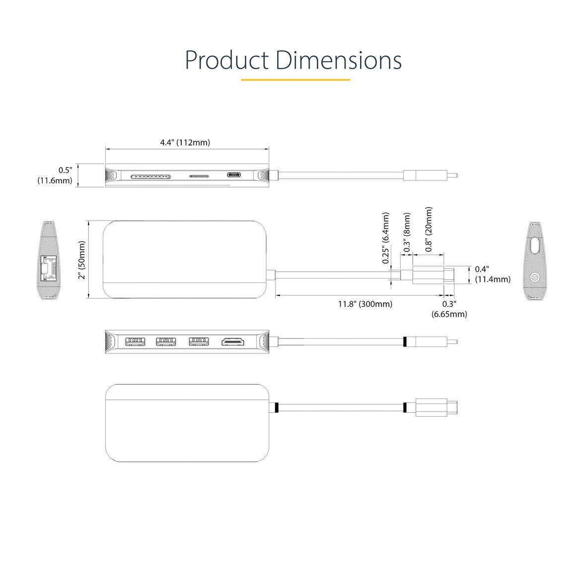 This USB-C™ Multiport Adapter with DP 1.4 Alt Mode supports 4K 60Hz HDMI® (HDR) and turns your MacBook, Dell XPS, or other USB-C laptop or tablet into a workstation, anywhere you go. The USB Type-C™ Multiport Adapter features a 4K HDMI video output, three USB 3.2 Gen 1 Type-A (5Gbps) ports, SD and MicroSD card readers and a Gigabit Ethernet port, all through one connection to your laptop's USB-C, USB4, or Thunderbolt 3/4™ port. Plus, it offers advanced charging and flexibility through a shared USB-C Power Delivery 3.0 and Data port which can be used to connect peripherals, with USB 2.0 transfer speeds (480Mbps), when a power source is not connected. The Multiport Adapter features an extra-long attached 12-inch (30 cm) host cable - for an extended reach, to offer more set up flexibility.