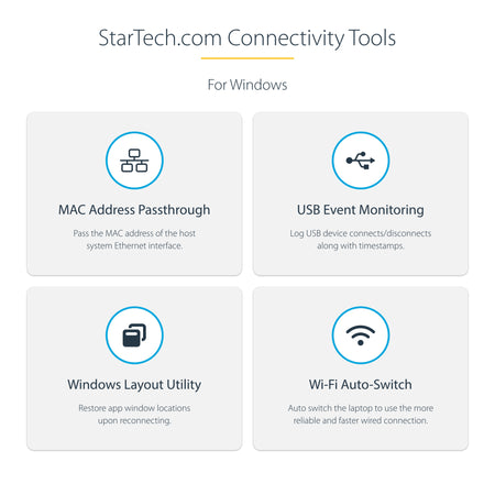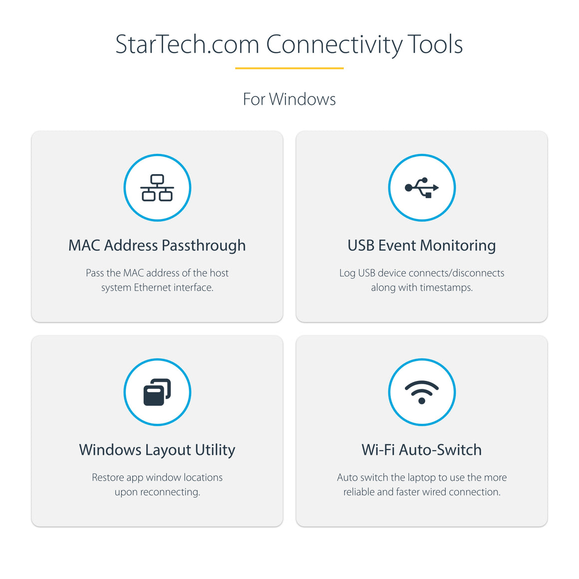- CONNECTIVITY TOOLS: Includes Network MAC Address Pass-Through, WiFi Auto Switching, USB Event Monitoring, and Windows Layout Utilities for IT Pro's and IT help-desk support teams; These tools are not included with docks from consumer brands