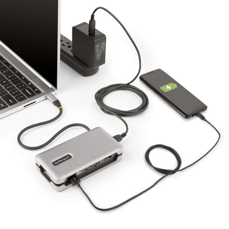 Connect this USB Type-C Multiport Adapter to a USB-C, USB4, or Thunderbolt 3/4™ laptop to enable single-display 4K 60Hz HDMI 2.0b or 1080p 60Hz VGA video output via DP Alt Mode. The USB-C dock works with USB Type-C laptops or tablets, such as a Chromebook, Dell XPS, or MacBook. It features a 3-Port USB 3.2 Gen 2 (10Gbps) Hub (2x USB-A, 1x USB-C), and Gigabit Ethernet. Connect the laptop USB-C power supply to the dedicated USB Power Delivery (PD) 3.0 port, to charge the laptop.