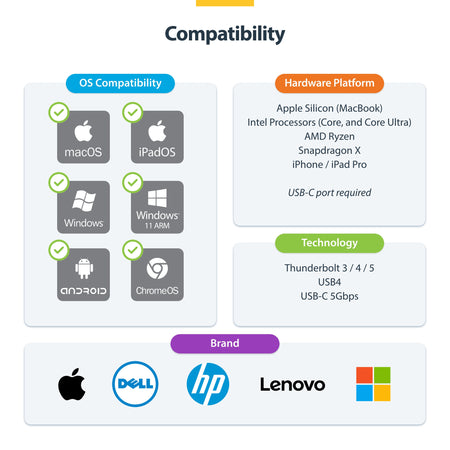 Enjoy plug-and-play functionality across a broad range of USB-C and Thunderbolt devices including laptops, tablets, and even USB-C-enabled phones. It works reliably across all major operating systems including Windows, macOS, iPadOS, iOS, Android, and Chrome OS.