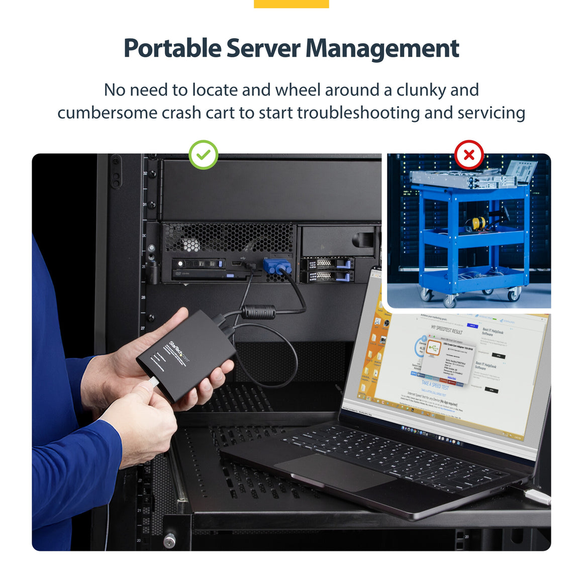 - LAPTOP TO SERVER: USB crash cart adapter connects your laptop to a headless system, turning your laptop into a portable console for rack servers in your server room, PCs, ATMs, kiosks, etc