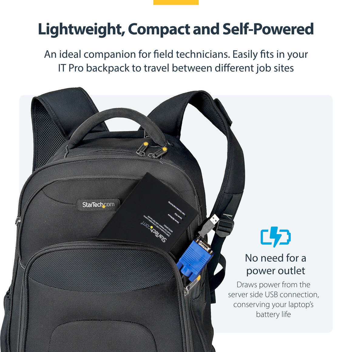 This pocket-sized adapter features a compact design that easily fits inside your laptop bag and requires no additional accessories to connect, eliminating the need to lug around a large, awkward traditional crash cart to troubleshoot and service your systems.