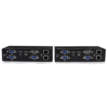 The dual VGA cat5 KVM extender supports easy to use hot-key and push button commands which allow you to switch between local and remote connected systems, while console connections at both ends of your setup provide easy access to all connected systems from either location. The hot-key commands also provide video adjustment controls for optimizing picture quality over varying distances. Extending over two standard Cat 5 (or better) cables gives you the ability to use existing infrastructure wiring to achieve remote access to your server or KVM switch.