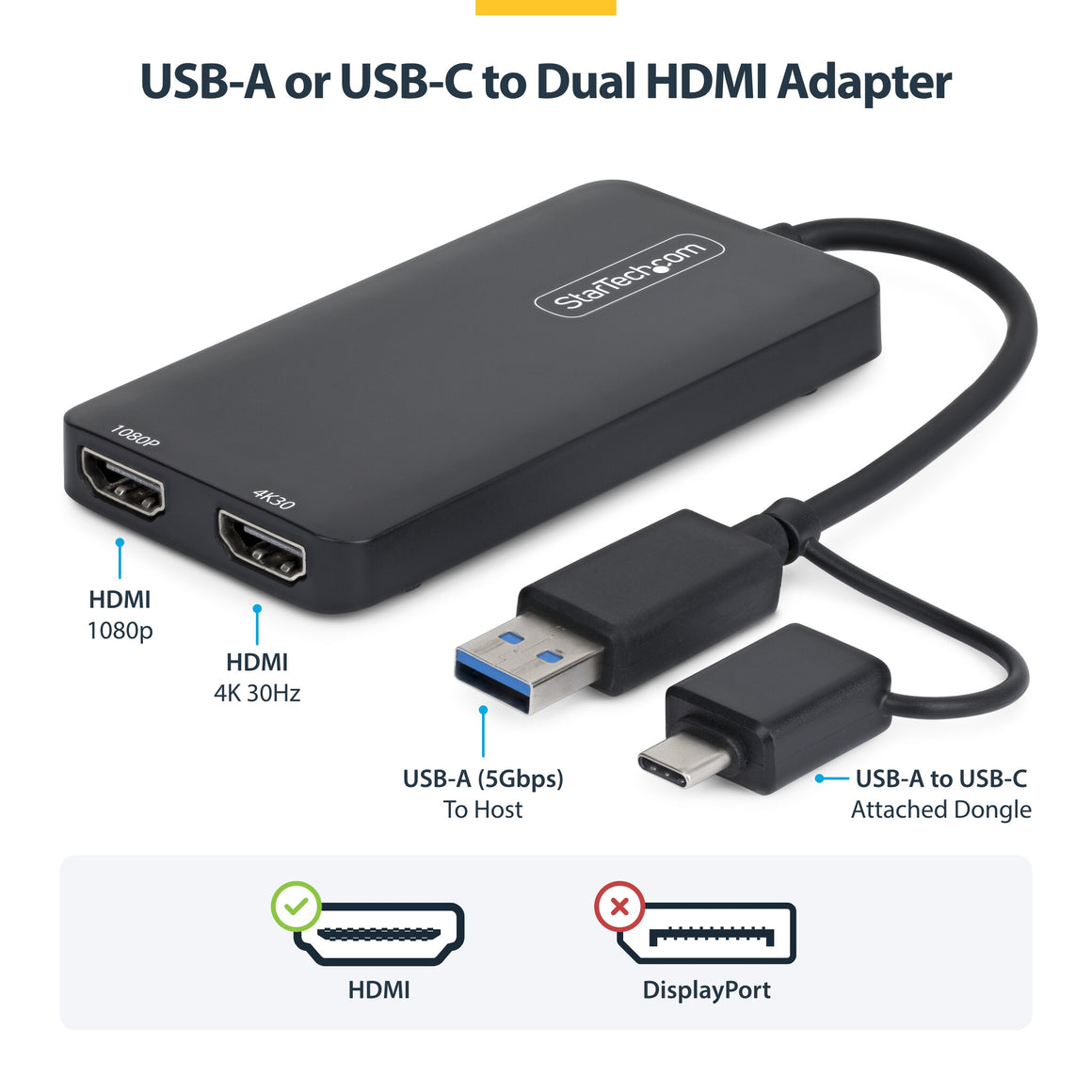 StarTech.com USB to Dual HDMI Adapter, USB A/C to 2x HDMI Displays (1x 4K30Hz, 1x 1080p), Integrated USB-A to C Dongle, 4in/11cm Cable, USB 3.0 to HDMI Display Adapter, Windows & macOS