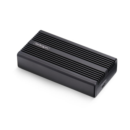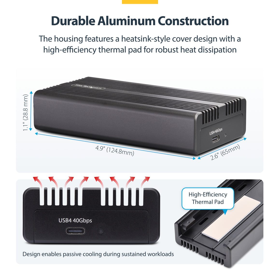 The USB4 NVMe Enclosure's compact footprint fits comfortably in a technician's toolkit or laptop bag. The rugged aluminum housing not only helps with heat dissipation but also protects the SSD from physical damage during transport or deployment in demanding environments.