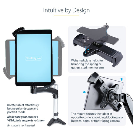 The clever design does not block the ports, front-facing camera, or buttons, allowing users to use all the tablet's features (remove any protective cases from the tablet). The 0.7 lb (0.35 kg) weighted plate can be added to the tablet mount, to ensure optimal operation of spring-assisted/one-touch monitor arms.