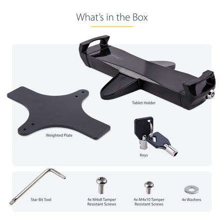 The VESA tablet mount features anti-theft measures that can deter the theft of the attached tablet. These theft prevention features include anti-tamper mounting screws and lockable tablet clamps. Locking the clamp is optional. Keys and tools are included.