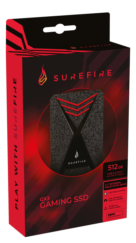 Games consoles have limited storage capacities and the latest games quickly fill them up leaving no space for new ones. The solution is to attach the SureFire Gaming SSD, which provides convenient and fast extended storage of your games, freeing up space on your console or PC. Featuring multi-colour RGB changing LED accent lights and an enclosure design influenced by the latest consoles, the SureFire Gaming SSD has no moving parts meaning faster load times allowing games to be stored and run directly from the external SSD.