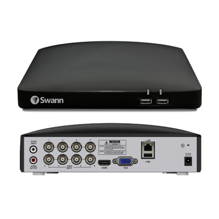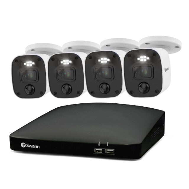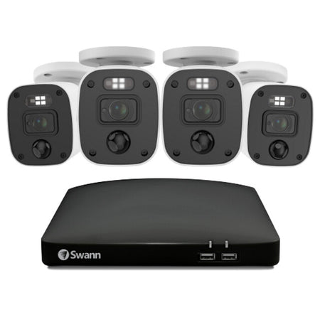 The Swann Home 2 Camera 4 Channel 1080p Full HD DVR Security System provides 24/7 surveillance with its 1080p HD cameras featuring microphones, controllable sensor spotlights, and red & blue flashing lights to deter intruders. It includes a 1TB hard drive for extensive recording and supports heat and motion detection for accurate alerts. The system is weatherproof and offers color night vision, ensuring clear footage day and night.