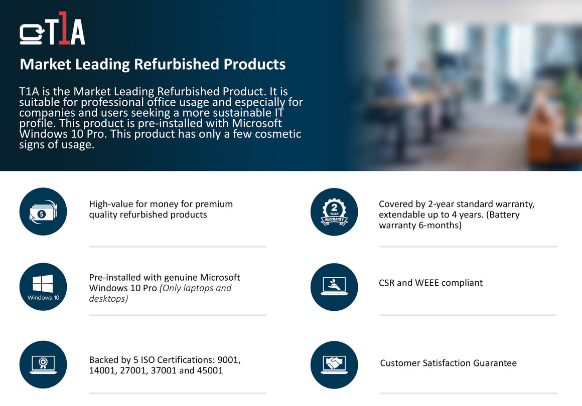 T1A is the Market Leading Refurbished product. It is suitable for professional office usage and especially for companies and users seeking a more sustainable IT profile. This product has only a few cosmetic signs of usage.