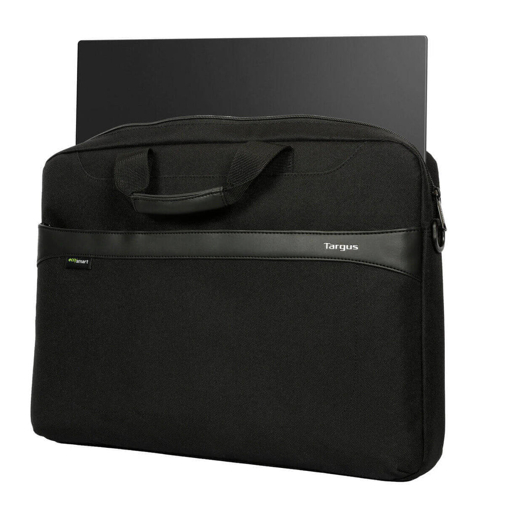 Stay organised and stay ahead with the 13-14" GeoLite EcoSmart® Slim Brief. Sporting a modern design, it’s ideal for professionals looking to balance style, storage, and laptop protection. Slimmer than a briefcase and more functional than a sleeve, the GeoLite EcoSmart® Slim Brief offers a divided laptop compartment allowing for a separate space for documents and files. The front zip compartment provides easy access to your phone, charger, and other accessories. Its removable shoulder strap, soft-grip handles, and luggage trolley strap offer comfortable carrying options. And, its water-resistant exterior and earth-conscious interior, deliver on style, functionality, and sustainability.