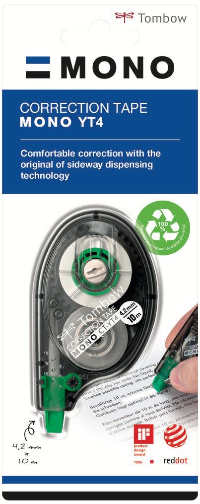 The original MONO correction tape has been the first for what the side-action correction is concerned. The natural, ergonomic posture guarantees a comfortable and precise correction. No drying time - can be written over instantly and cleanly. Due to the „Tombow Coating Technology" even cleaner re-writing is possible. Tear-proof tape (PET) - can be dispensed down to the last millimetre. With the help of the easy to use reset button the tape can, if necessary, be tightened (Tape control system).Housing made of 100% recycled plastic. Awarded with the iF product design award and the red dot design award in 1996. Tape: 4.2 mm x 10 m.