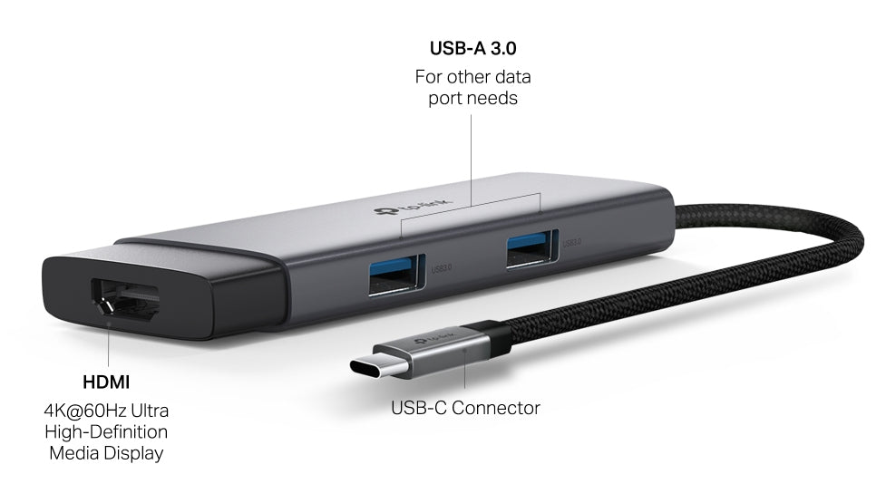 UH5020C turns a single USB-C port into 5 ports with a 4K@60Hz HDMI, 100W Power Delivery, 1× USB-C Data Port, 2× USB-A Data Ports.
