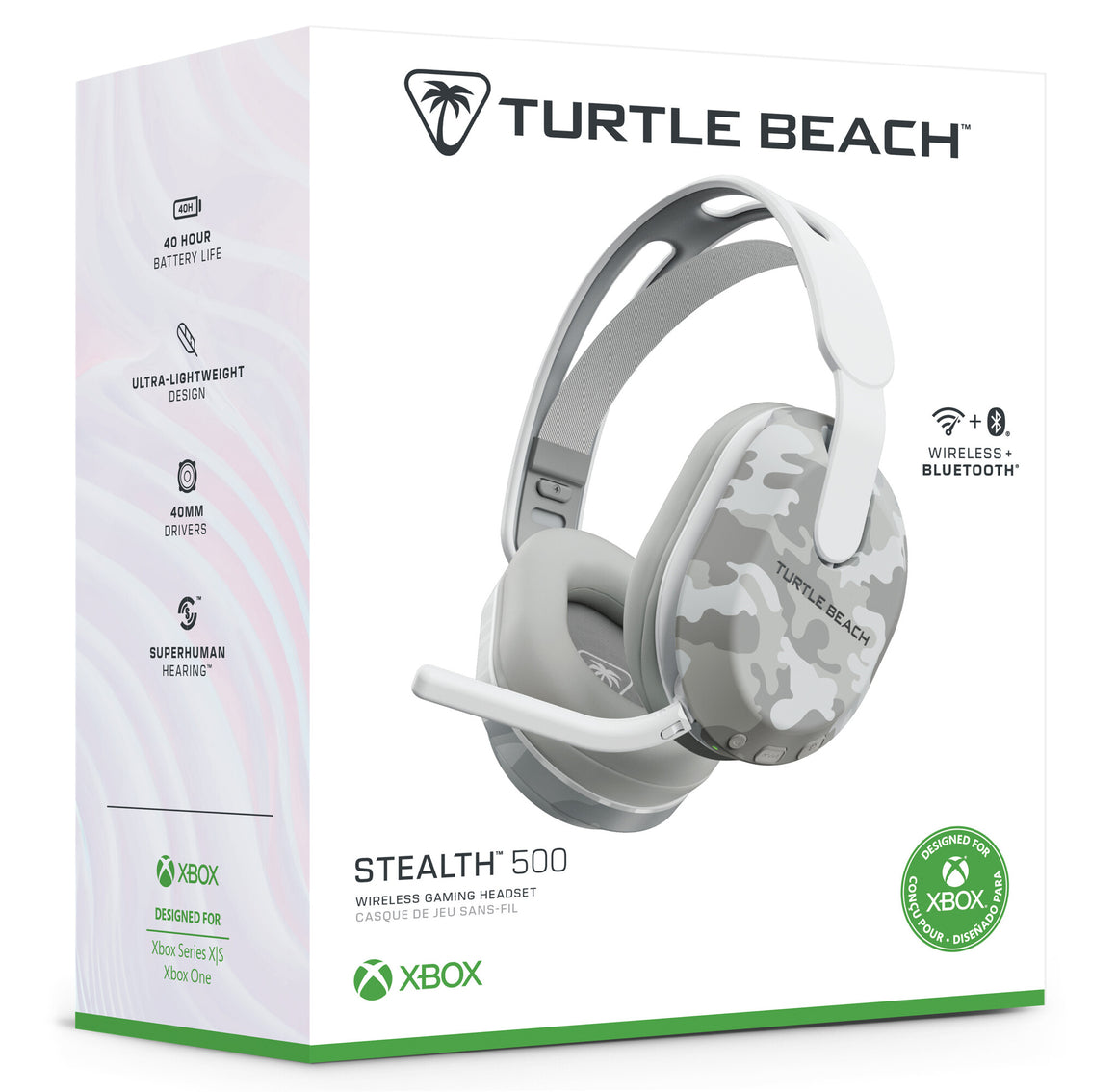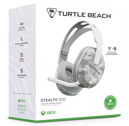 The Turtle Beach® Stealth™ 500 wireless amplified gaming headset for Xbox Series X|S, Xbox One redefines what an “entry-level” wireless headset is capable of. Equipped with low-latency, 2.4GHz wireless for gaming on Xbox® consoles plus Bluetooth® 5.2 connectivity for use on PC, & mobile, the Stealth™ 500 is designed for versatile gaming on console & mobile. Easily toggle back-and-forth between 2.4GHz wireless & Bluetooth® connections using the QuickSwitch button located right on the bottom of the headset. An ultra-lightweight design with a floating headband eliminates any pressure points for a perfect fit and leatherette-wrapped memory foam ear cushions provide non-stop comfort and enhanced noise isolation. A staggering battery life of up to 40 hours is best in its class, plus it features quick charge so you can get back in the game right away. Precision-tuned 40mm drivers are amplified to deliver renowned Turtle Beach® audio quality, optimized for spatial audio right out of the box. And to dial in your audio quality even further use the Swarm™ II desktop software for PC, or mobile app for iOS & Android devices to adjust EQ settings, activate Superhuman Hearing®, toggle EQ presets and more. Lead your team to victory with ultra-clear voice accuracy thanks to a flip-to-mute omni-directional microphone. Plus, you can activate mic monitoring using the Swarm™ II app so you can hear the level of your own voice to avoid shouting.