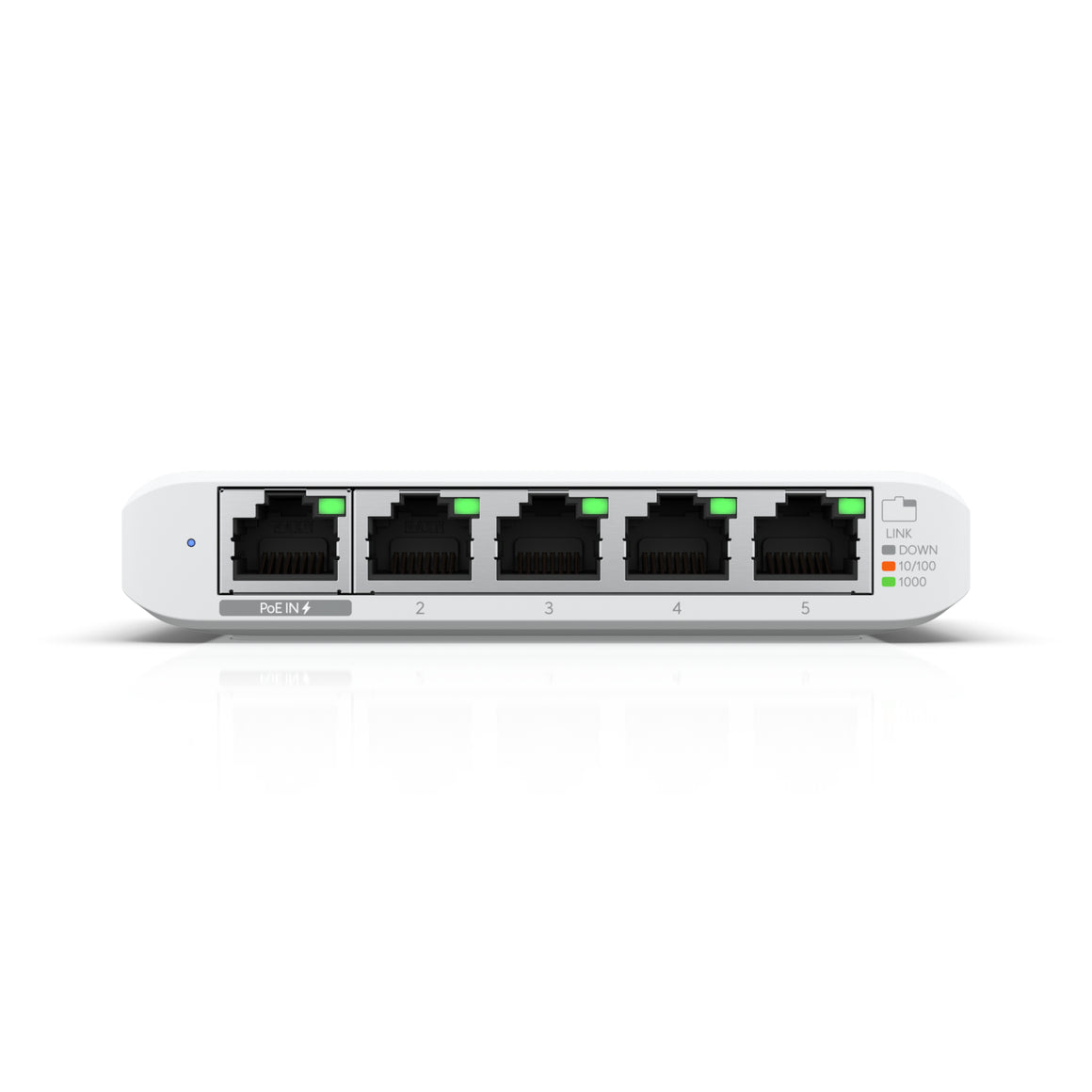 A compact, 5-port, Layer 2 switch that can be powered with PoE or a 5V USB-C adapter.