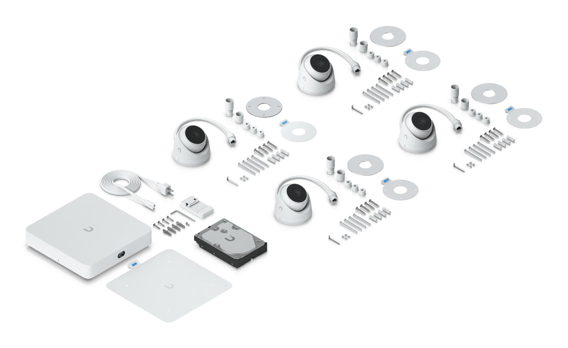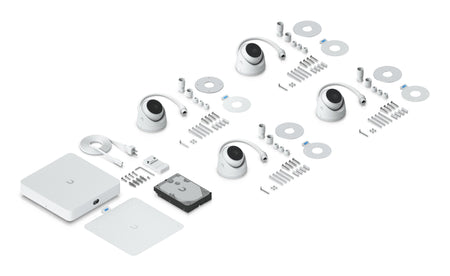 Compact UniFi Protect NVR Kit, includes (1) UniFi Protect NVR Instant with (4) G5 Turret Ultra cameras and (1) 1TB HDD, delivering an all-in-one solution for fast and effortless setup.