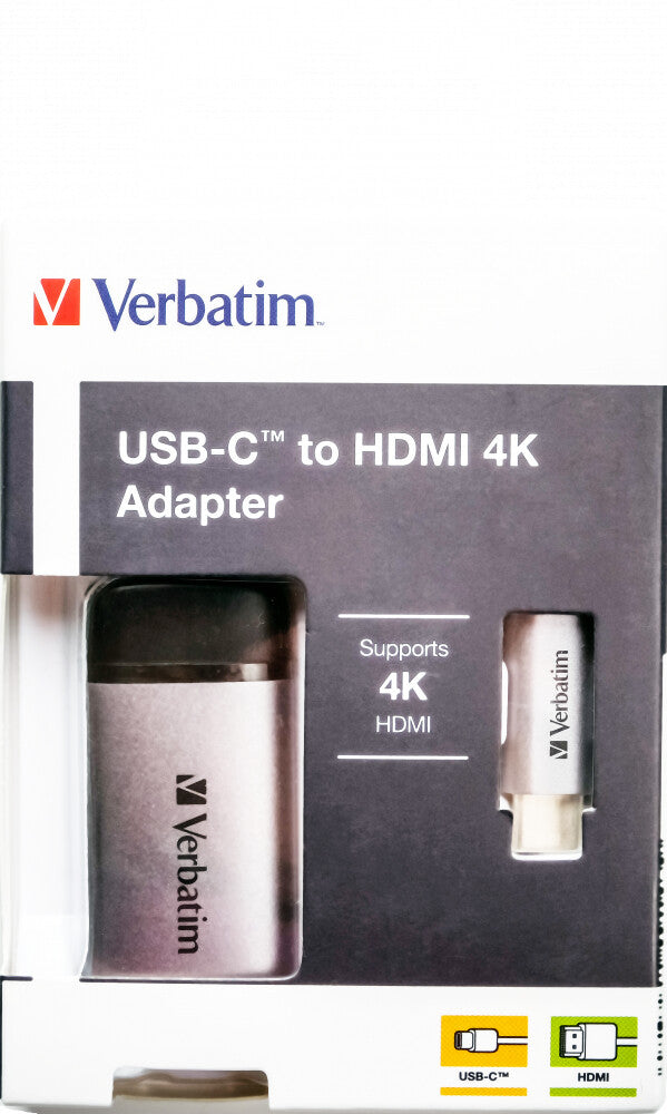 The Verbatim USB-C to HDMI 4K adapter lets you connect your USB-C or Thunderbolt 3 (USB-C) enabled smartphones, laptops and MacBooks to a projector, HDTV or monitor that supports HDMI. It is the ideal companion for the latest slimline laptops and MacBooks that come with limited ports. No need to replace your whole setup when you upgrade your laptop, simply connect the adapter to a USB-C port on your laptop and then plug in an HDMI cable to connect to your display.