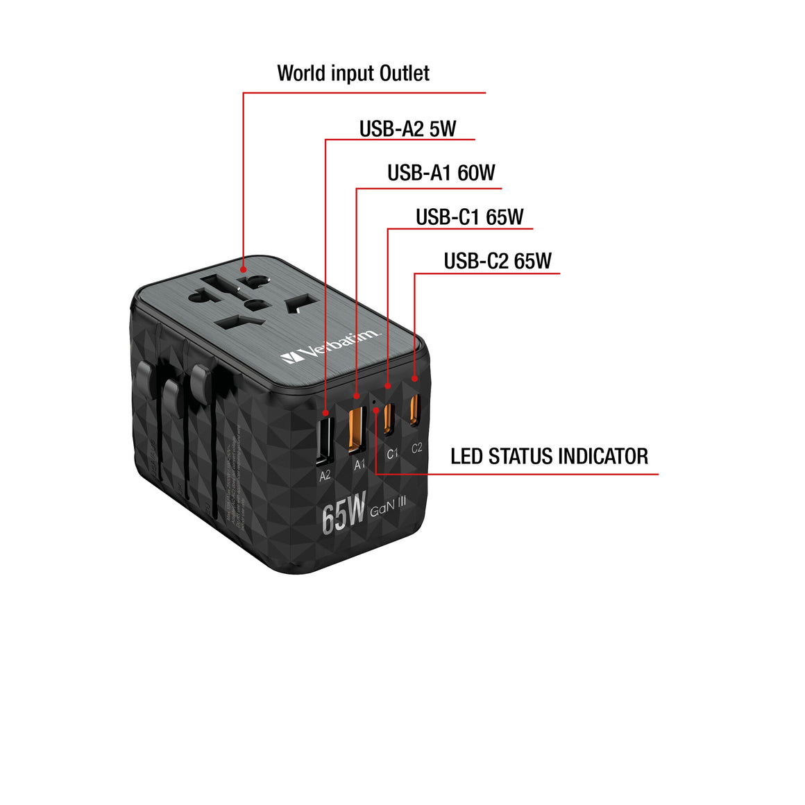 The compact and powerful Verbatim GaN III Universal Travel Adapter allows five devices to be charged simultaneously through the AC power socket and the two USB-C and two USB-A ports.