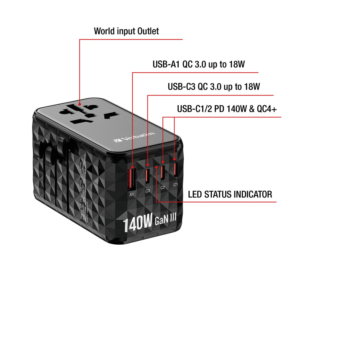 The compact and powerful Verbatim GaN III Universal Travel Adapter allows five devices to be charged simultaneously through the AC power socket and the three USB-C and single USB-A ports.
