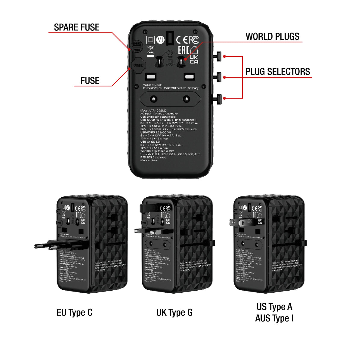 The Verbatim GaN III Universal Travel Adapter can be used in more than 180 countries – take it everywhere with you and never be out of power. This world-to-world multi plug will allow you to connect to any local power supply around the world and recharge your power-hungry devices, like laptops, smartphones, Bluetooth speakers, tablets, power banks, and more. Just push the sliders on the side of the multi plug to reveal the three most common international plugs - EU, UK, and US - and rotate the pins for sockets in Australia or China.